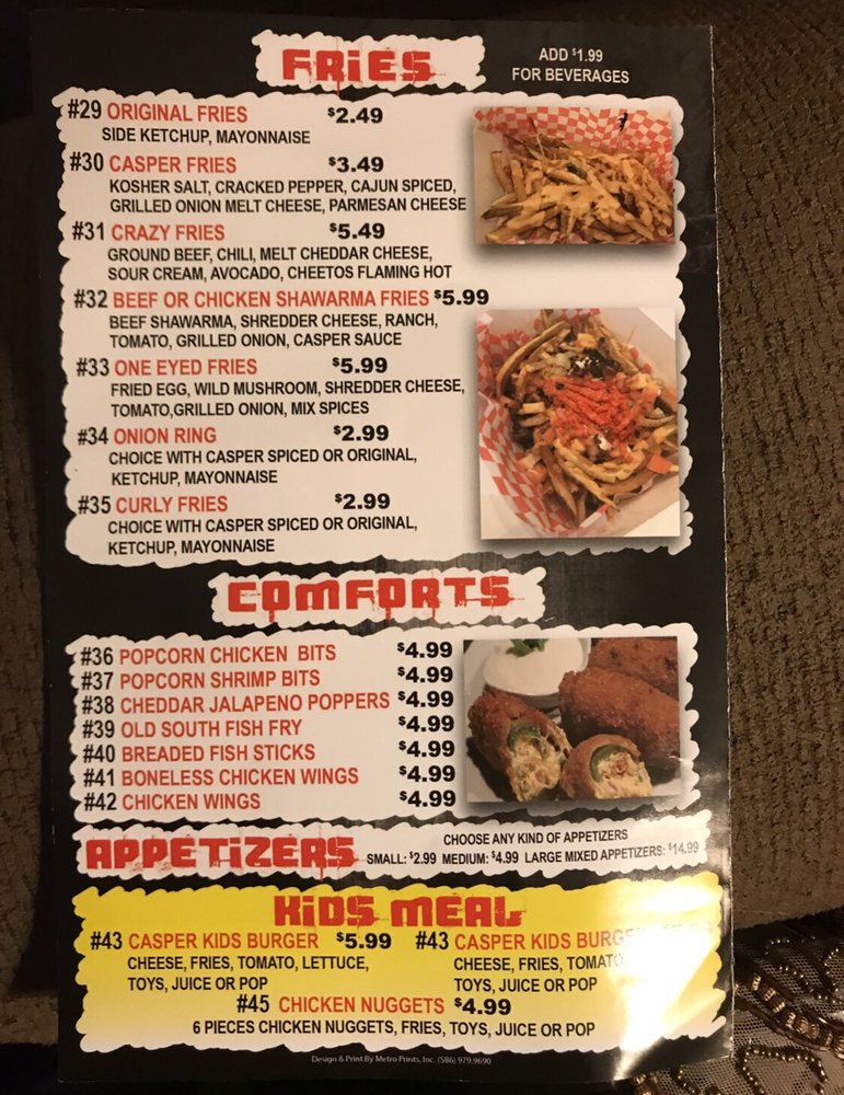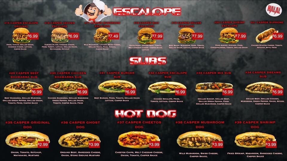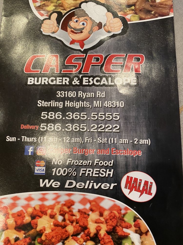 Casper Burger & Escalope offers a unique dining experience with a diverse menu that includes burgers, subs, comfort foods, hot dogs, and more. Located in Sterling Heights, MI, this restaurant provides delivery, takeout, and reservation options, making it convenient for all. With a focus on vegetarian options and a range of comforts like popcorn chicken bits and cheddar jalapeno poppers, there is something for everyone to enjoy. Customers praise the generous portions and affordable prices, with standout items like the Casper Burger and the Casper Original Dog receiving high praise. The value for money and the halal status of the food add to the appeal of dining at Casper Burger & Escalope. If you're looking for a casual yet classy dining experience with tasty and unique offerings, this restaurant is definitely worth a try.