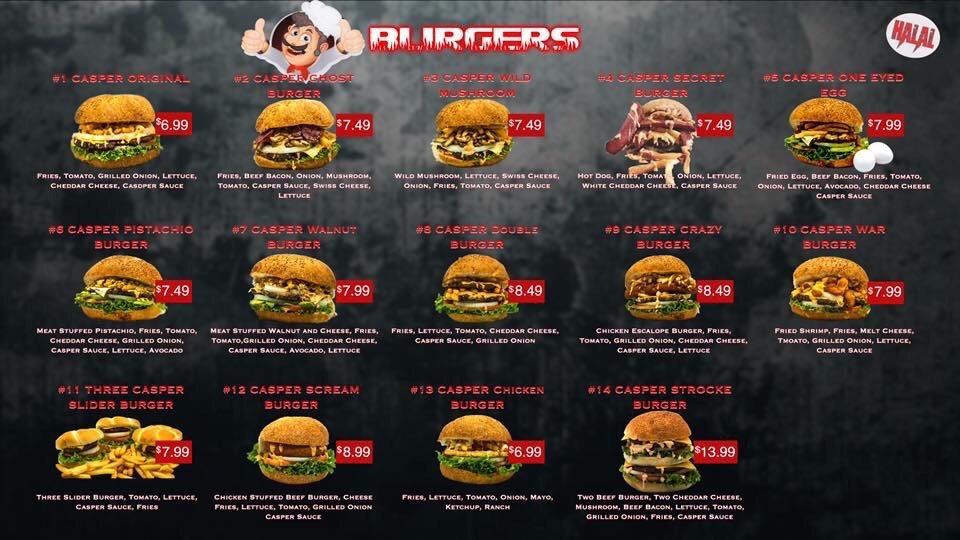 Tow beef burger, 2 cheddar cheese, mushroom, beef bacon, lettuce, tomato, grilled onion, fries and Casper sauce.